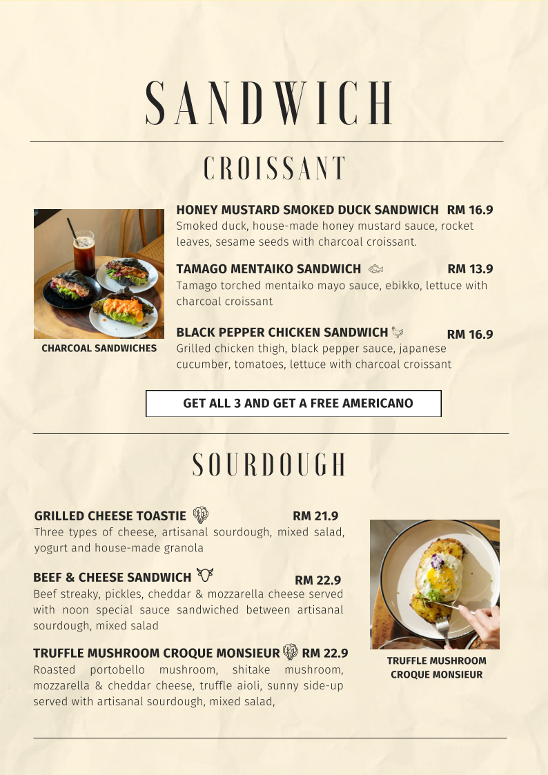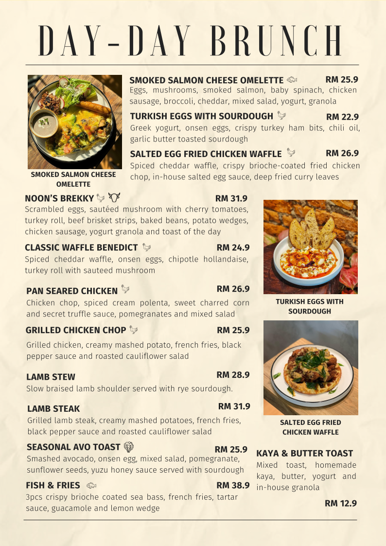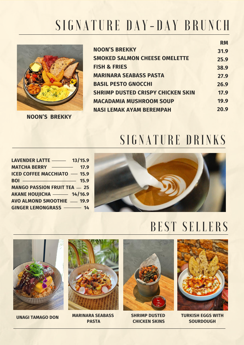 From a reviewer’s perspective, the menu at Noon Viennoiserie Cafe, located at 22, Jalan SS 4c/5, Taman Rasa Sayang, Petaling Jaya, feels like a thoughtfully curated summary of everything the café stands for: comfort, creativity, and all-day indulgence. The experience begins with small but essential EXTRAS like Butter, Kaya, Mushroom, Soft Shell Crab, and Sambal, which subtly elevate many dishes. Their SIGNATURE DAY-DAY BRUNCH offerings, such as NOON’S BREKKY, SMOKED SALMON CHEESE OMELETTE, FISH & FRIES, MARINARA SEABASS PASTA, and BASIL PESTO GNOCCHI, highlight a balance between hearty Western brunch staples and refined café-style plates.