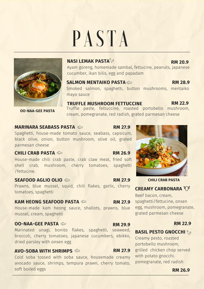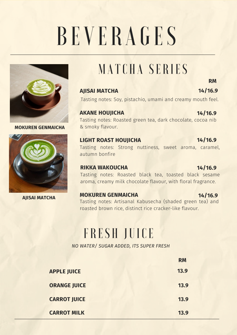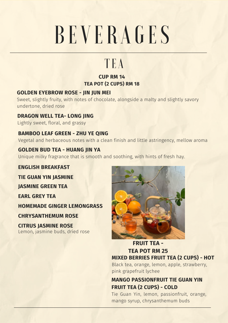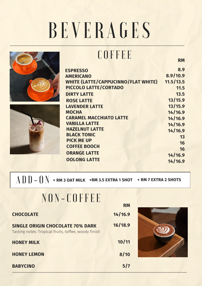 From a reviewer’s perspective, the menu at Noon Viennoiserie Cafe, located at 22, Jalan SS 4c/5, Taman Rasa Sayang, Petaling Jaya, feels like a thoughtfully curated summary of everything the café stands for: comfort, creativity, and all-day indulgence. The experience begins with small but essential EXTRAS like Butter, Kaya, Mushroom, Soft Shell Crab, and Sambal, which subtly elevate many dishes. Their SIGNATURE DAY-DAY BRUNCH offerings, such as NOON’S BREKKY, SMOKED SALMON CHEESE OMELETTE, FISH & FRIES, MARINARA SEABASS PASTA, and BASIL PESTO GNOCCHI, highlight a balance between hearty Western brunch staples and refined café-style plates.