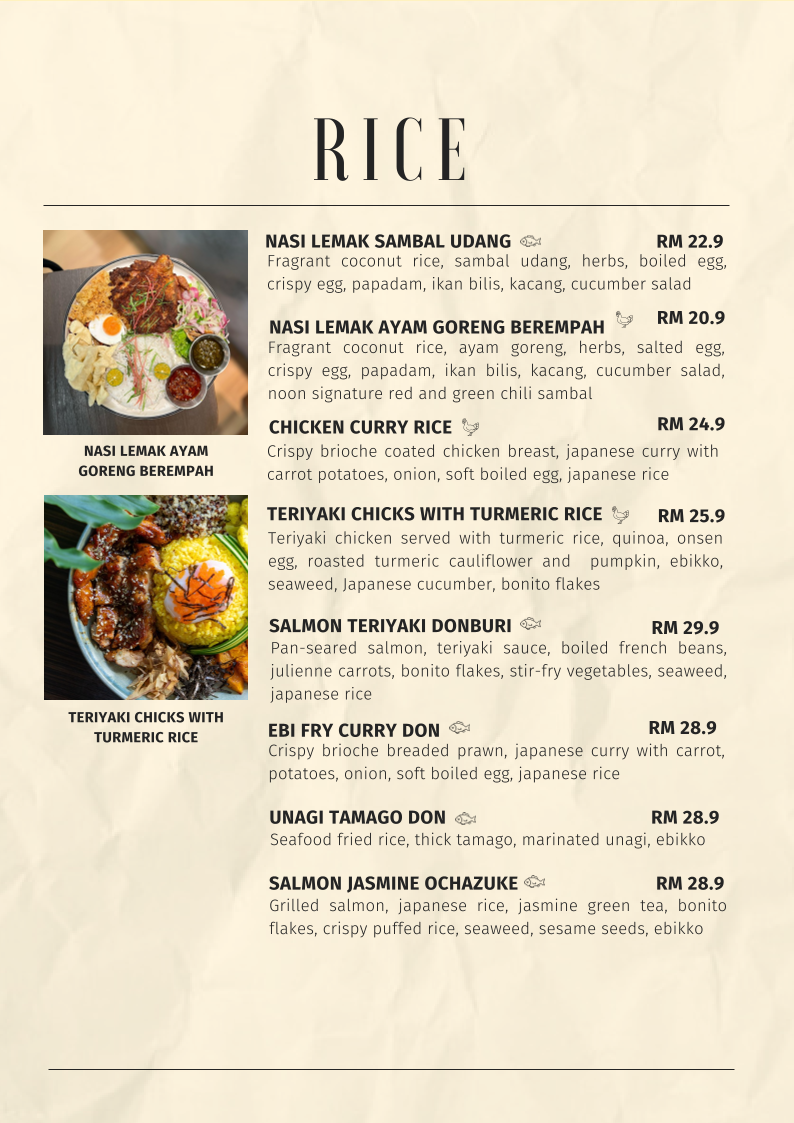 For more substantial meals, the DAY-DAY BRUNCH section revisits favorites like TURKISH EGGS WITH SOURDOUGH, SALTED EGG FRIED CHICKEN WAFFLE, and CLASSIC WAFFLE BENEDICT, while the PASTA and RICE selections showcase local-inspired creativity through dishes like NASI LEMAK PASTA, CHILI CRAB PASTA, NASI LEMAK SAMBAL UDANG, and SALMON TERIYAKI DONBURI. Drinks are equally impressive, from SIGNATURE DRINKS such as LAVENDER LATTE and MATCHA BERRY, to a comprehensive list of COFFEE, MATCHA SERIES, TEA, FRESH JUICE, REFRESHERS, and SMOOTHIES. Overall, Noon Viennoiserie Cafe’s menu feels complete and cohesive, wrapping up the dining experience with variety, quality, and a clear identity that lingers long after the last sip or bite.