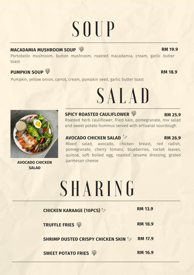 The menu flows naturally into comforting starters like MACADAMIA MUSHROOM SOUP and PUMPKIN SOUP, alongside fresh and vibrant salads such as SPICY ROASTED CAULIFLOWER and AVOCADO CHICKEN SALAD. For sharing, crowd-pleasers including CHICKEN KARAAGE (10PCS), TRUFFLE FRIES, SHRIMP DUSTED CRISPY CHICKEN SKINS, and SWEET POTATO FRIES make the table feel instantly more social. Sandwich lovers are well taken care of, whether it’s buttery croissant options like HONEY MUSTARD SMOKED DUCK SANDWICH, TAMAGO MENTAIKO SANDWICH, and BLACK PEPPER CHICKEN SANDWICH, or sourdough classics such as GRILLED CHEESE TOASTIE, BEEF & CHEESE SANDWICH, and TRUFFLE MUSHROOM CROQUE MONSIEUR.